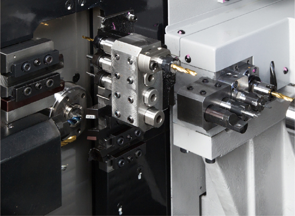 特征 ・ 利用背軸和背面刀臺,可同時進行正面·背面加工 ・ 可選配3軸 、4軸橫向動力頭、橫向剛性攻絲、正面剛性攻絲、背面剛性攻絲(選配) ・ 可選配無導套裝置,最適宜短工件高精度加工(選配)